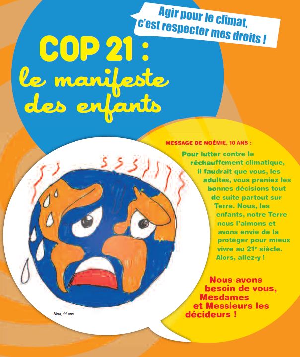 A l’heure où la COP 21 occupe tous les esprits, Solidarité Laïque a édité un manifeste des enfants pour la COP21, suite à la participation de près de 400 enfants et jeunes à l’activité pédagogique « Agir pour le climat, c’est respecter mes droits ! ». Pour l’Entraide Universitaire, il s’agit de jeunes de la MECS du Mazel qui ont fait le voyage à cette occasion.