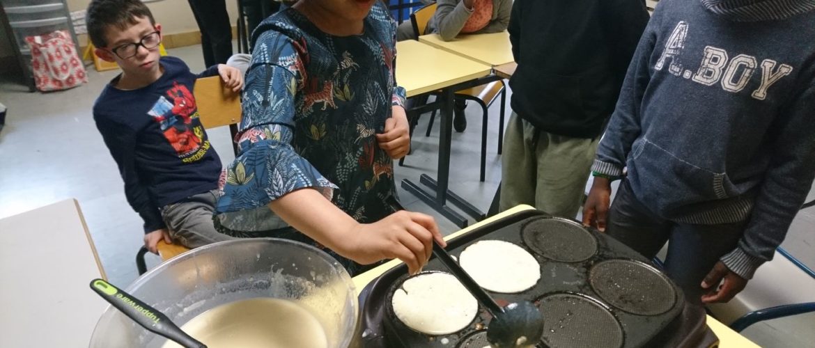 Cette fois ci, après avoir lu la recette en classe, les jeunes de l’IME ont réalisé des crêpes et ont invité les élèves de la classe de CE1 à venir à l’IME.