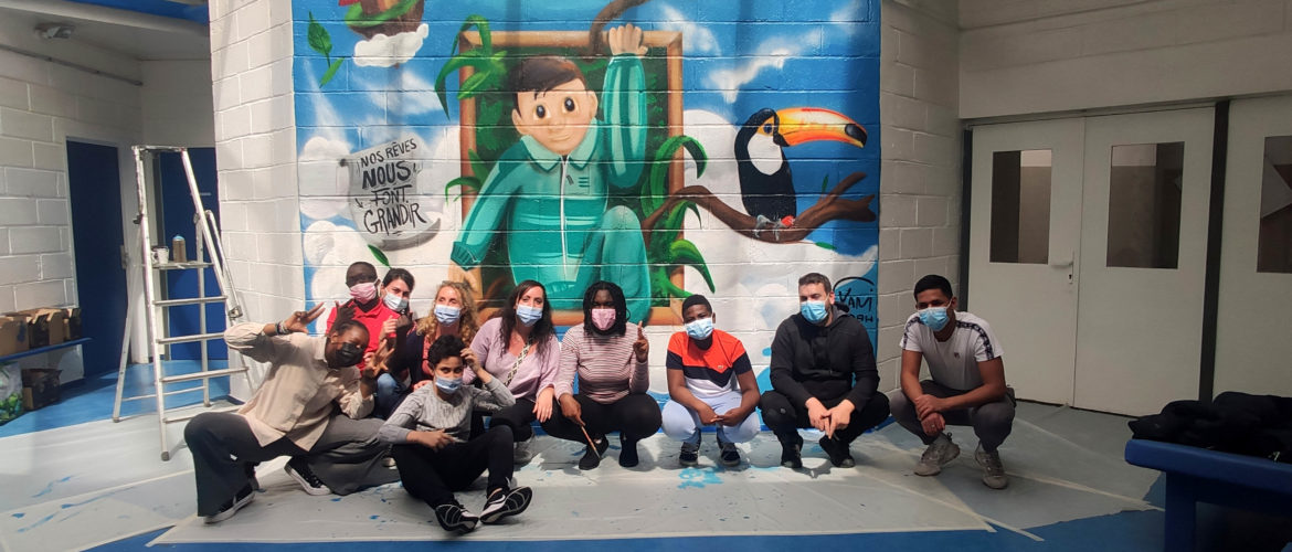 Dans le cadre de l’atelier culturel de l’IME Daniel Séguret, nous avons organisé au mois de mars, deux sorties sur le thème du street art. Les jeunes se sont montrés très réceptifs à cette forme d’art et ont évoqué l’idée de réaliser eux mêmes une fresque dans l’établissement. Nous avons donc contacté un grapheur qui est venu pendant toute une semaine au mois de mai pour réaliser une œuvre collective en partant des envies des jeunes. Tout le monde était ravi de cette expérience enrichissante.