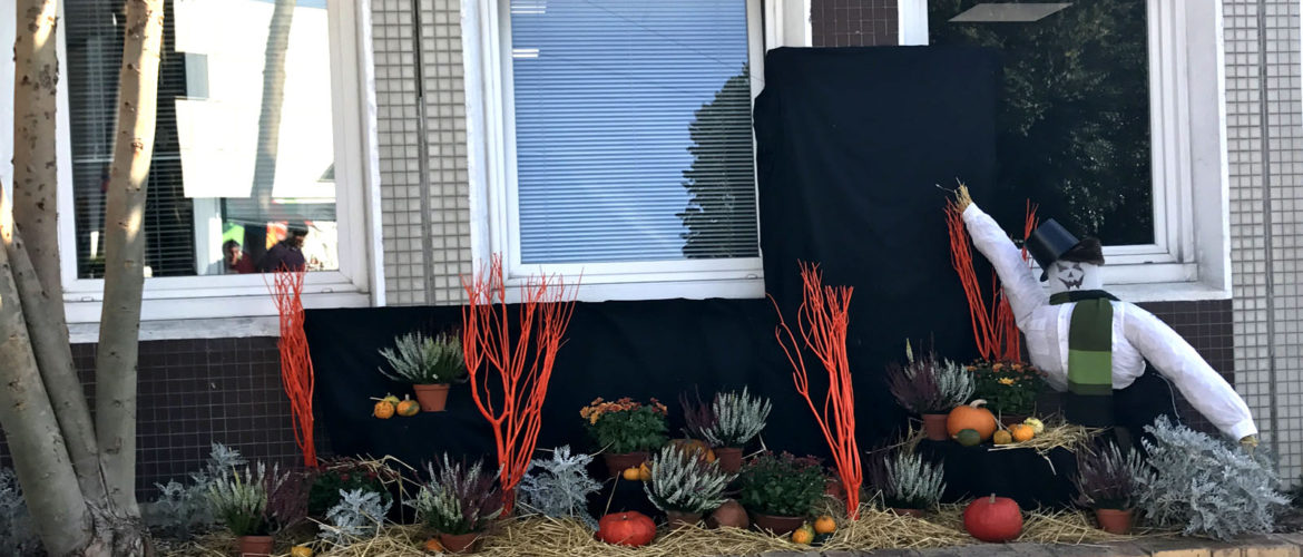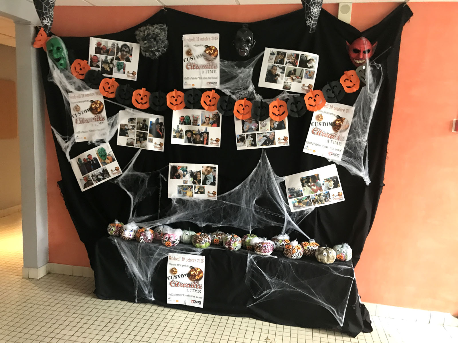 L’atelier Jardin Espace Vert de l’IME Henri Wallon nous offre un panneau décoratif extérieur élaboré avec les jeunes de l’atelier. A l’intérieur des locaux administratifs, c’est le travail des jeunes : décoration de citrouilles organisé par notre partenaire CKDB qui s’est exposé à l’accueil.