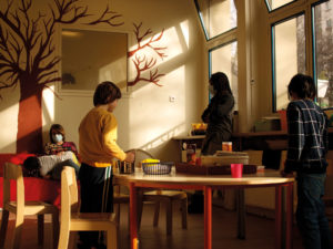 - Soigner par la rencontre avec d’autres enfants: par l’expérience de petits groupes, intermédiaires de par leur taille entre celle d’une famille et celle d’une classe, et par la vie en commun des quinze enfants accueillis chaque jour.