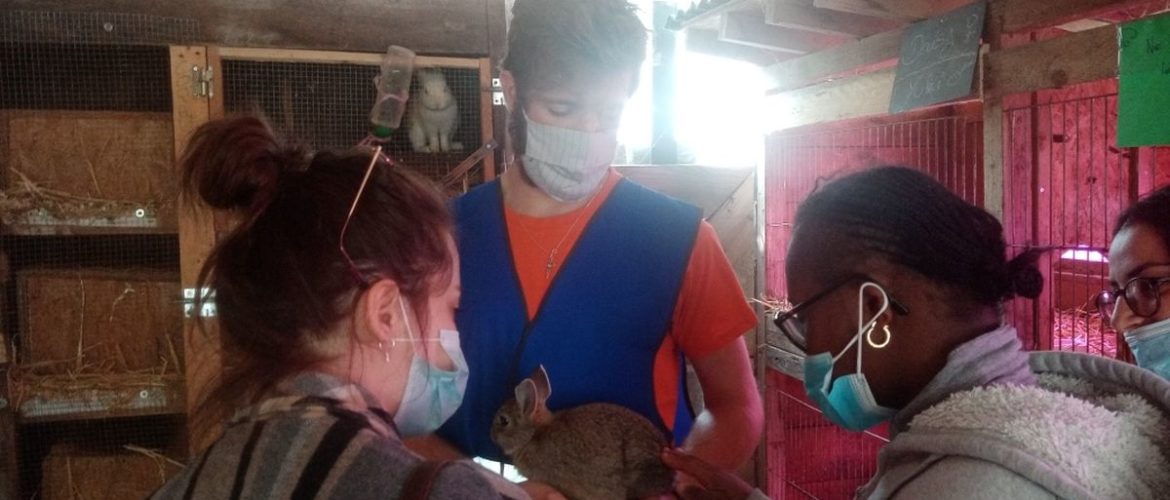 La propriétaire de la ferme nous présente ses animaux. Elle organise des ateliers sensoriels : les jeunes y caressent les animaux installés sur une table et une vraie rencontre se crée. Des bacs sensoriels sont également à leur disposition : plumes, laines, graines…