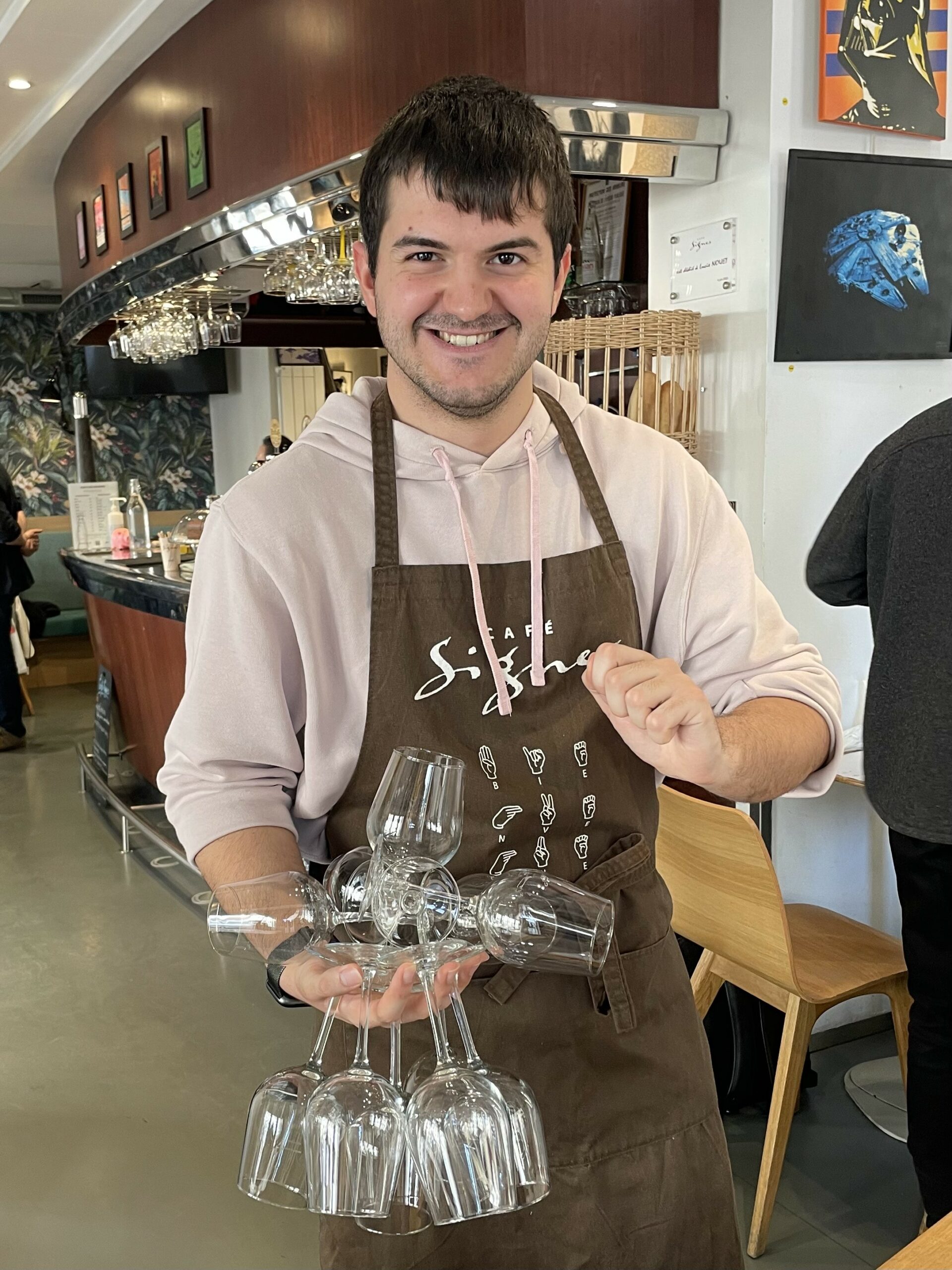 Arrivé au Café Signes avec beaucoup de timidité, Vitor a progressivement intégré son environnement ; le contact quotidien avec les clients, ainsi que le soutien bienveillant de l’équipe, ont joué un rôle essentiel dans cette évolution.